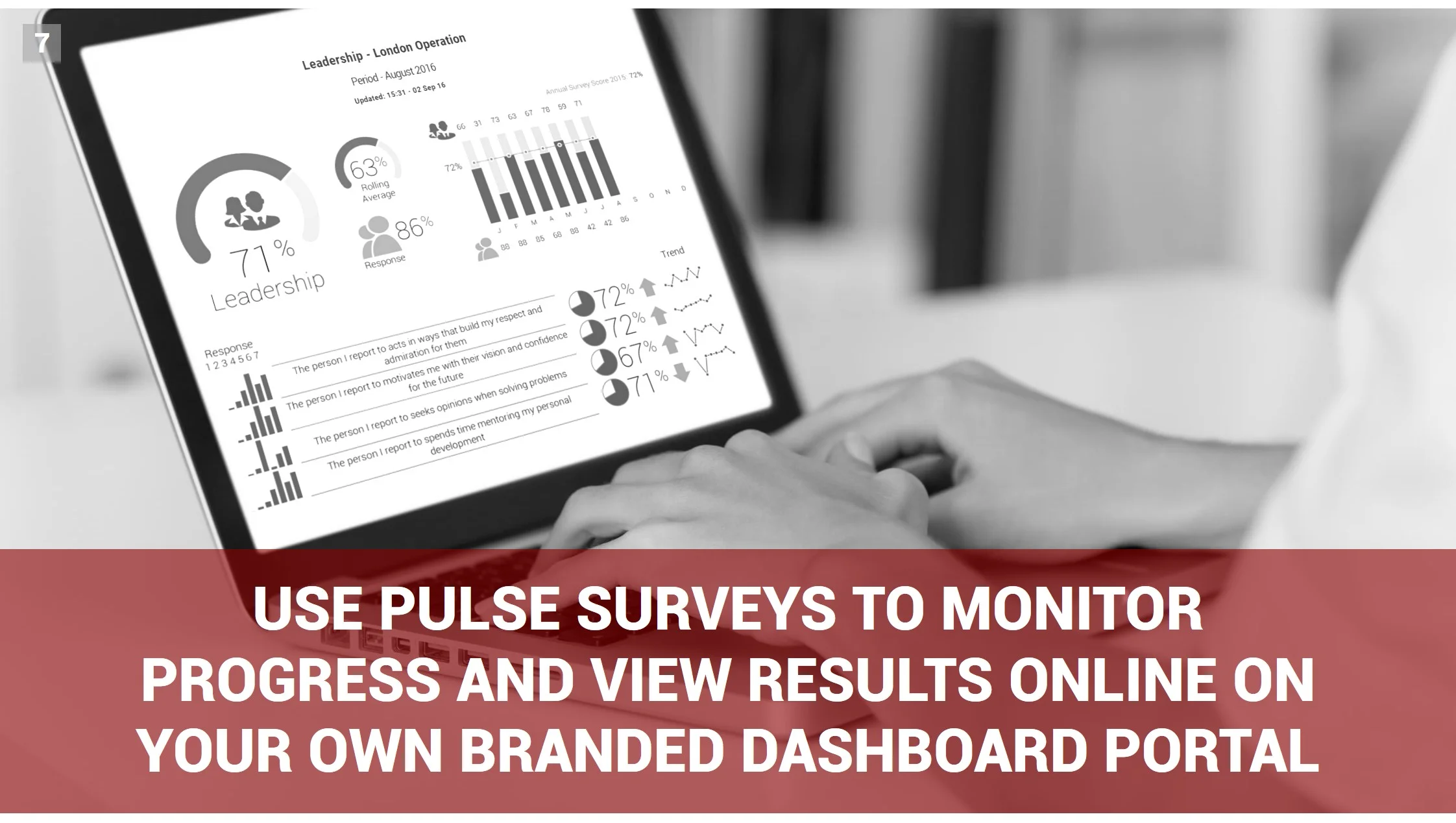 Pulse Surveys: Pulse surveys are generally used to monitor progress against the actions you have put in place following an annual survey. With Gravitas you have the option for online access to your own branded portal where you can review the survey results in departmental dashboards. You can determine the frequency of pulse surveys and also the content of the metrics. Results can be viewed real time on any device (PC, laptop, tablet or smartphone) putting you ahead of the game.